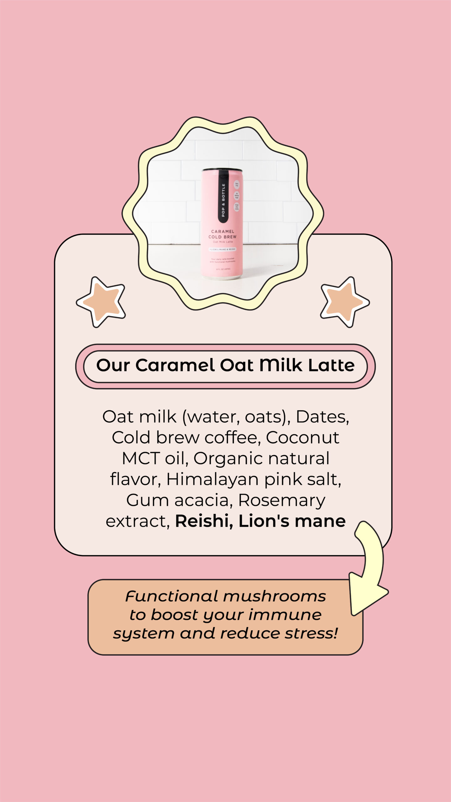 BOOSTED WITH FUNCTION: Have your coffee and get that glow! With Lion’s Mane and Reishi mushrooms, this latte is more than just a drink, it’s also a dose of nourishment for your hair, skin and nails.